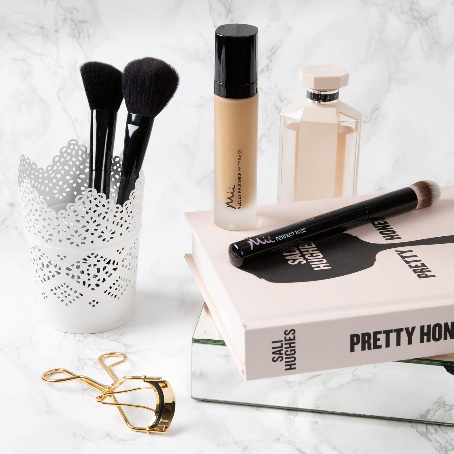 Rozpocznij aplikację podkładu od środka twarzy i rozprowadź go przy użyciu pędzla Mii Perfect Base Brush.