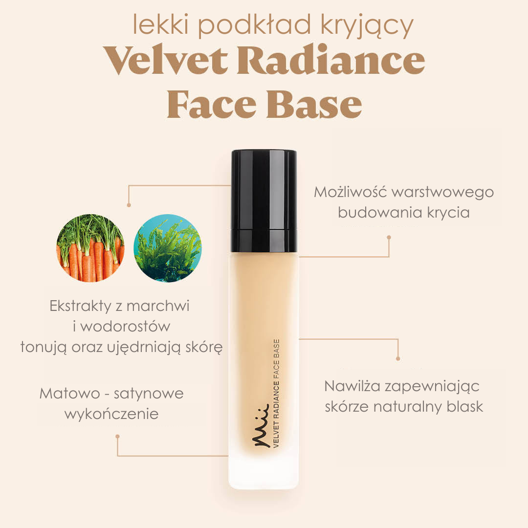Lekki podkład Mii Velvet Radiance kryje drobne zmarszczki i niedoskonałości skóry, wyrównuje jej koloryt, zapewniając perfekcyjny wygląd. Bogata kompozycja komórek z marchwi i ekstraktu z wodorostów chroni, tonuje i ujędrnia skórę twarzy, wspomaga jej nawilżenie i nadaje cerze naturalny blask.